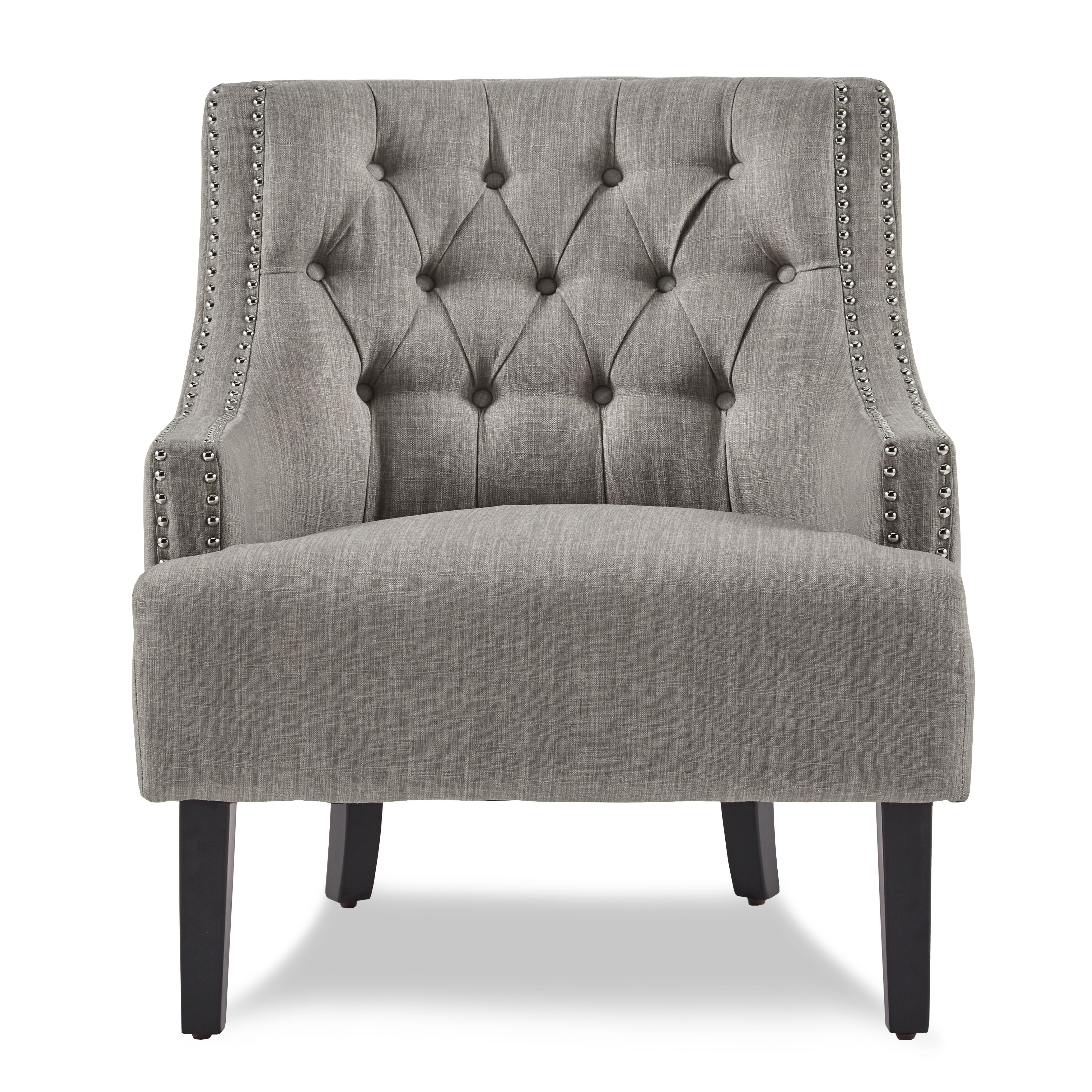 High polish nailhead accents and defines the profile of the Charisma Collection. This modern traditional teal fabric-covered accent chair provides a stylish, yet functional addition to your home. The chair is offered in 3 additional distinct colors: chocolate, taupe and indigo.PRODUCT DIMENSIONS: Overall Dimension: 28" x 30" x 34"HSeat Width: 22.5"Seat Depth: 22.5"Seat Height: 18"Arm height: 21.5"Listing Includes: One Accent Chair Only.Simple Assembly Require.