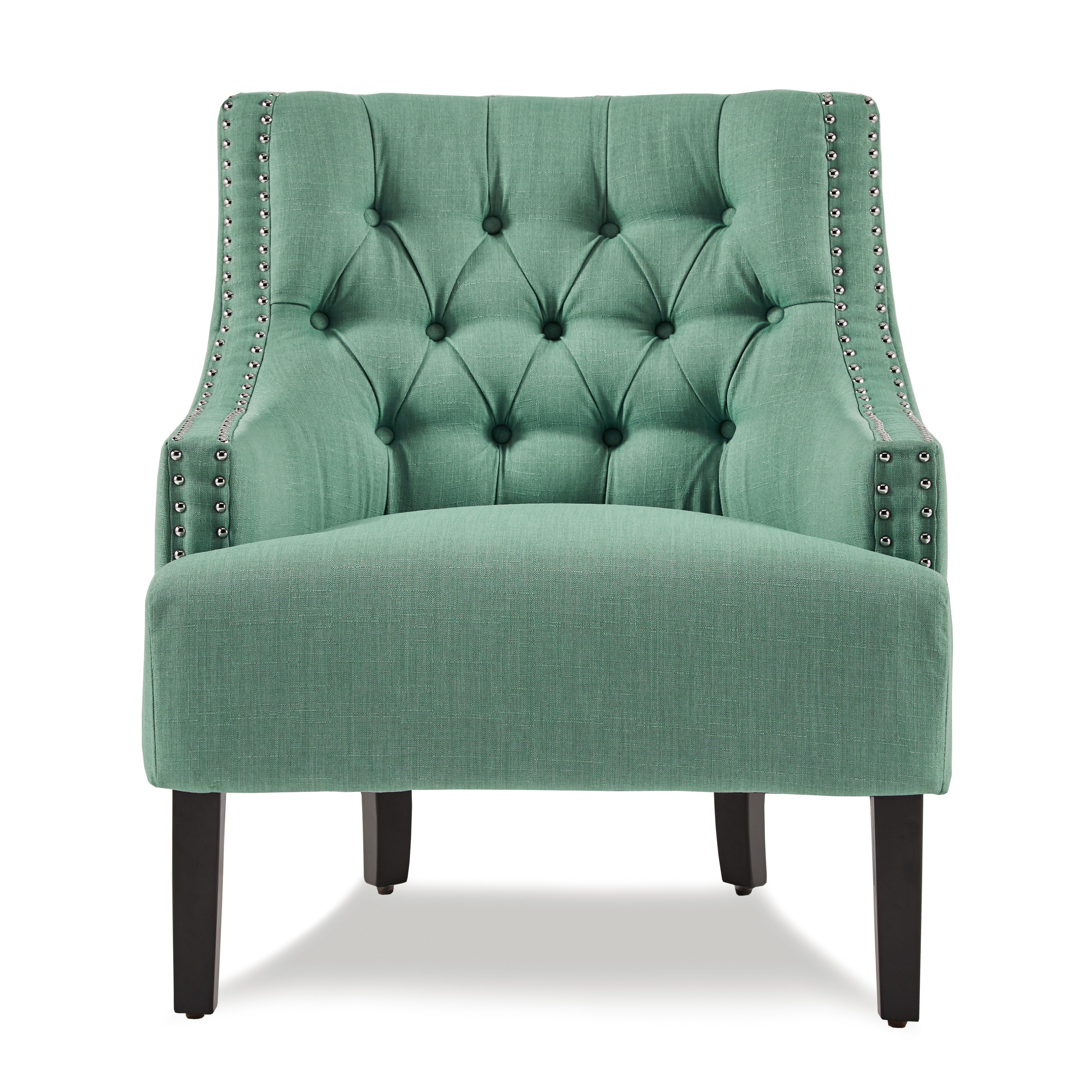 High polish nailhead accents and defines the profile of the Charisma Collection. This modern traditional teal fabric-covered accent chair provides a stylish, yet functional addition to your home. The chair is offered in 3 additional distinct colors: chocolate, taupe and indigo.PRODUCT DIMENSIONS: Overall Dimension: 28" x 30" x 34"HSeat Width: 22.5"Seat Depth: 22.5"Seat Height: 18"Arm height: 21.5"Listing Includes: One Accent Chair Only.Simple Assembly Require.