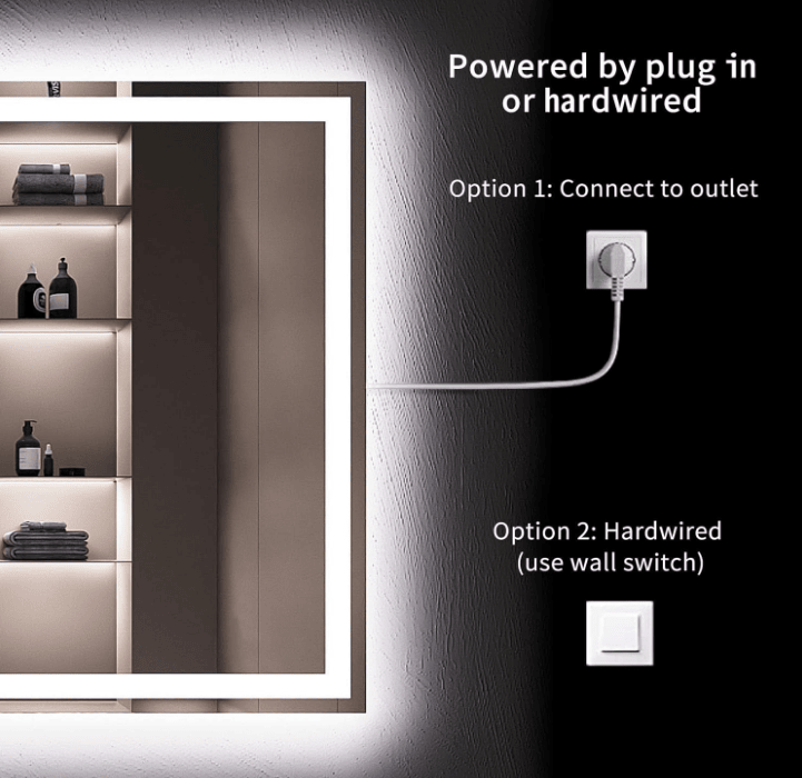 Backlight + headlight, light belt: LED bathroom mirror has a built-in LED light strip, which can control the backlight and headlight for lighting. The power supply and LED lights are UL certified and have a service life of more than 50,000 hours. It has two built-in IP54 waterproof LED strips to provide backlight and front light. The mirror is made of 4mm anti-broken tempered glass.